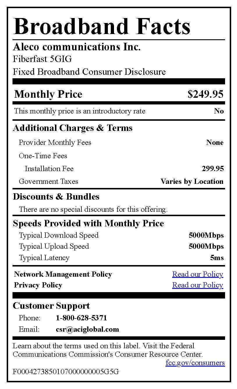 Alexander 5GIG PHONE & INTERNET Broadband Nutrition Label